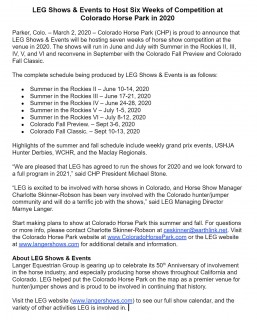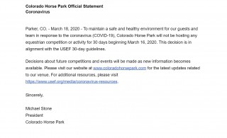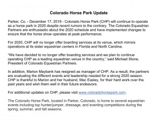 The Colorado Horse Park, located in Parker, Colorado, is home to a number of equestrian events including top hunter/jumper, dressage, and eventing competitions during the spring, summer, and fall seasons. The facility also includes annual boarding for over 100 horses.